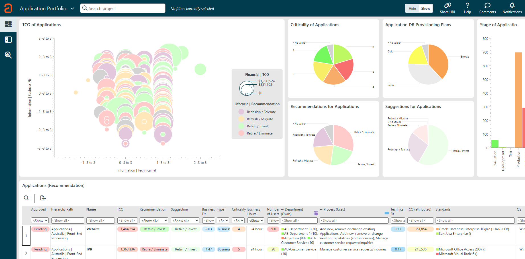 ABACUS delivers a comprehensive APM software solution and portfolio management tools that automate and enrich every phase of your application portfolio journey. Pre‑built algorithms let you configure diagnostics to track health metrics such as cost, reliability, and risk, while flexible cost modeling covers both CapEx and OpEx (including indirect expenses like server costs) to build a complete cost profile for each application. Interactive portfolio management software dashboards enable real‑time assessments into your repository, so you can answer detailed questions quickly. You can also set up analytics to forecast metrics into the future.