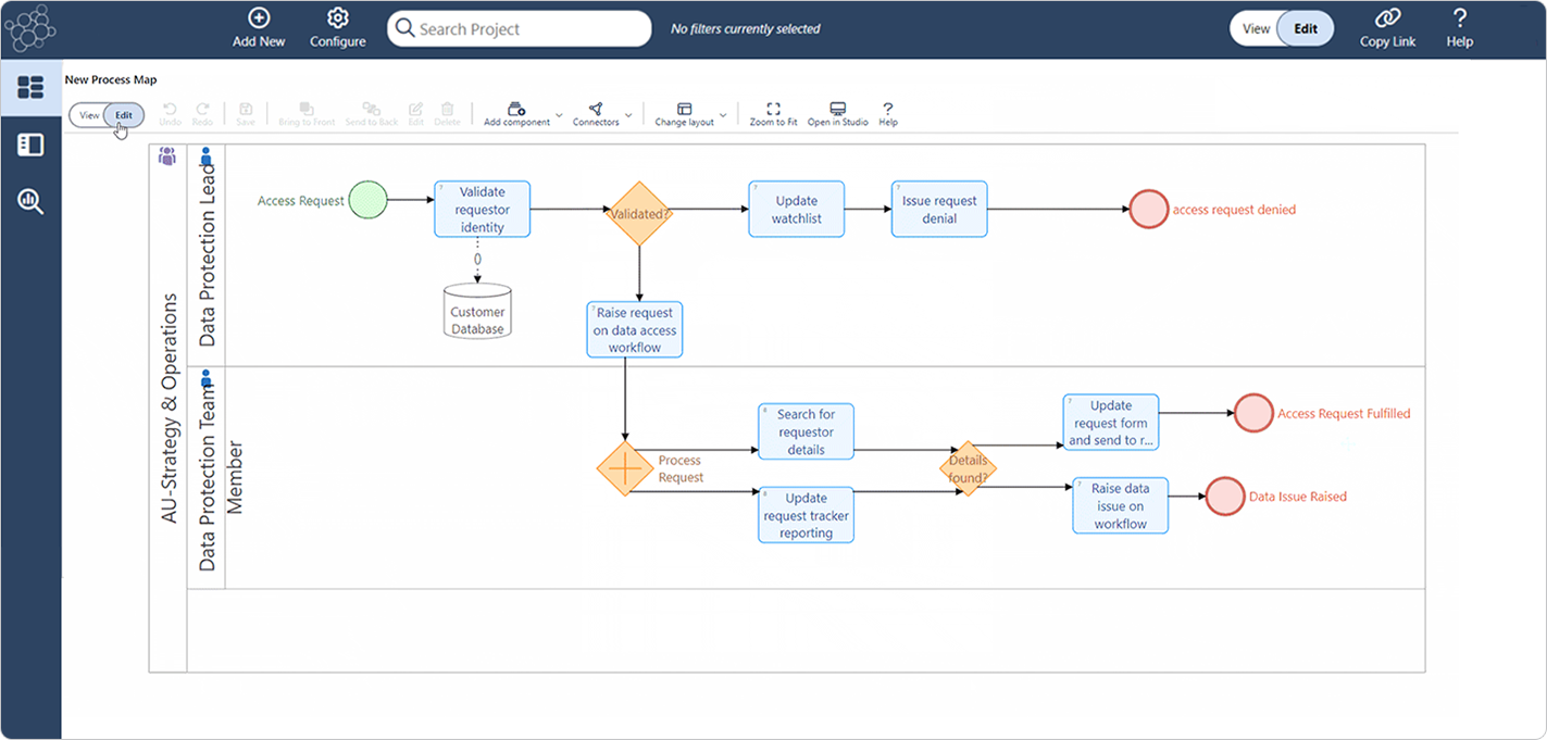 In BPMN, where pools and lanes represent participants in a process, such as role, department or even application, you can map these component types to swimlanes in your configured viewpoints. Similarly, data objects in BPMN can be linked to data entities in your repository. This helps you connect processes to other areas of your architecture, providing a comprehensive view of your enterprise without unnecessary duplication.
