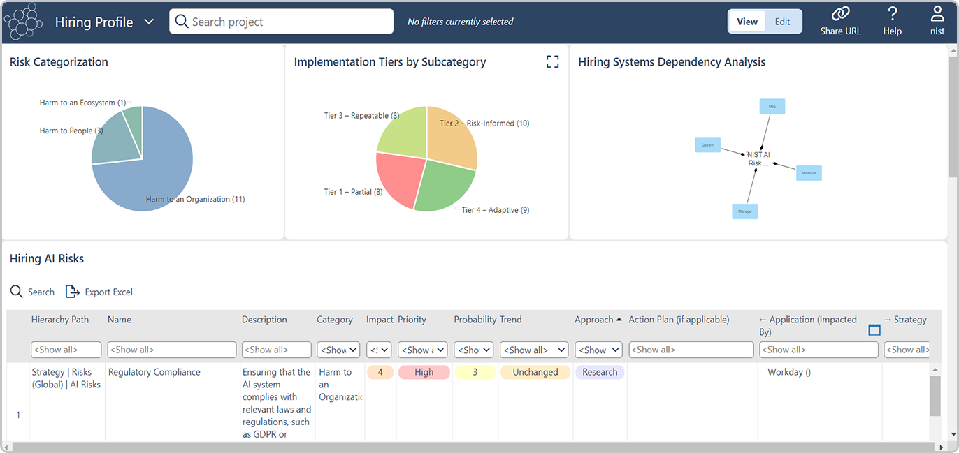 The ABACUS dashboard below demonstrates how the NIST AI framework can be applied to a specific AI application within an organization, in this case, a hiring tool.