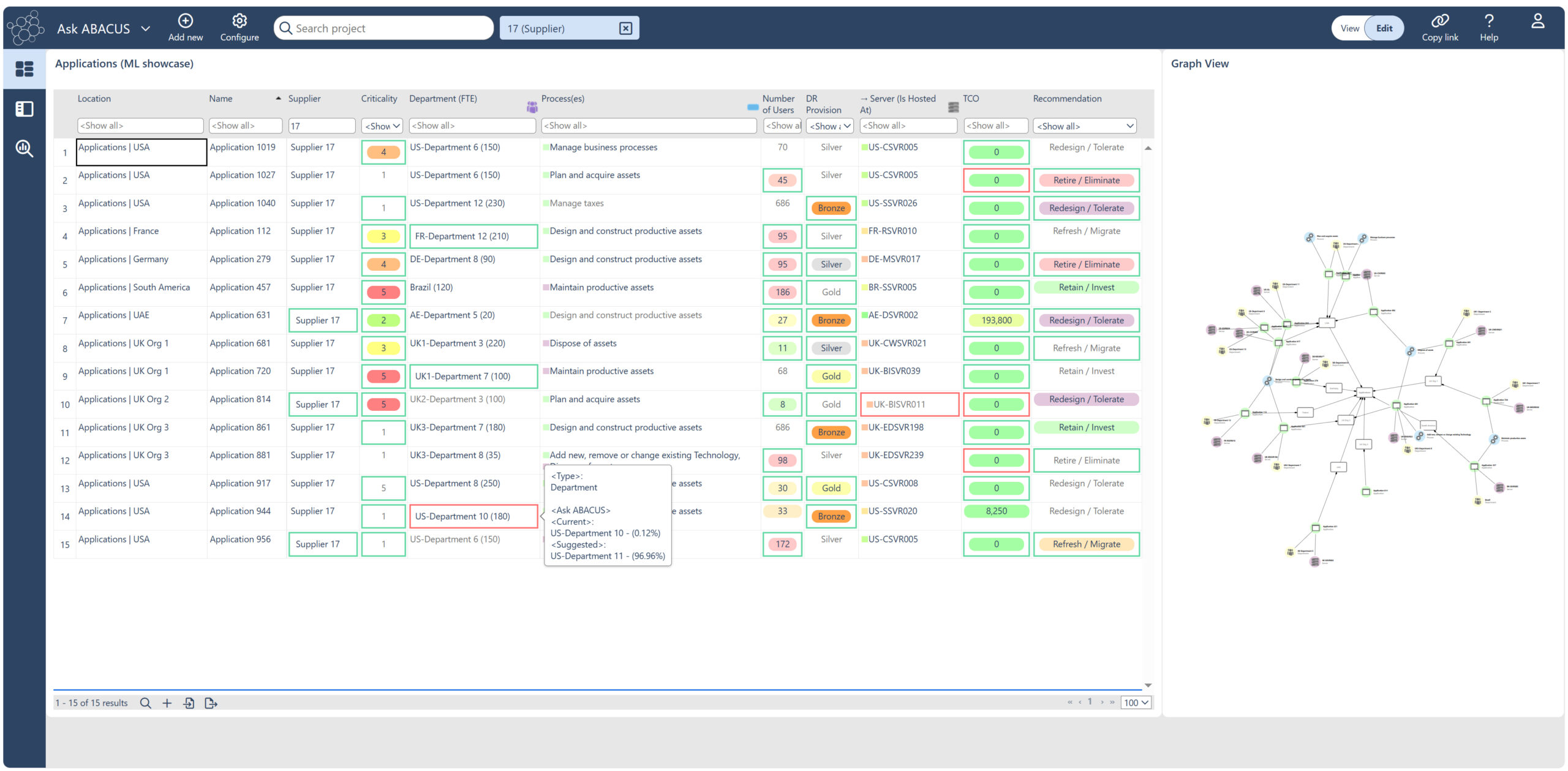 And in the example below, if we’re unsure which department owns or uses Application 944, Ask ABACUS can analyze our data and suggest with over 96% confidence that it belongs to US-Department 11.