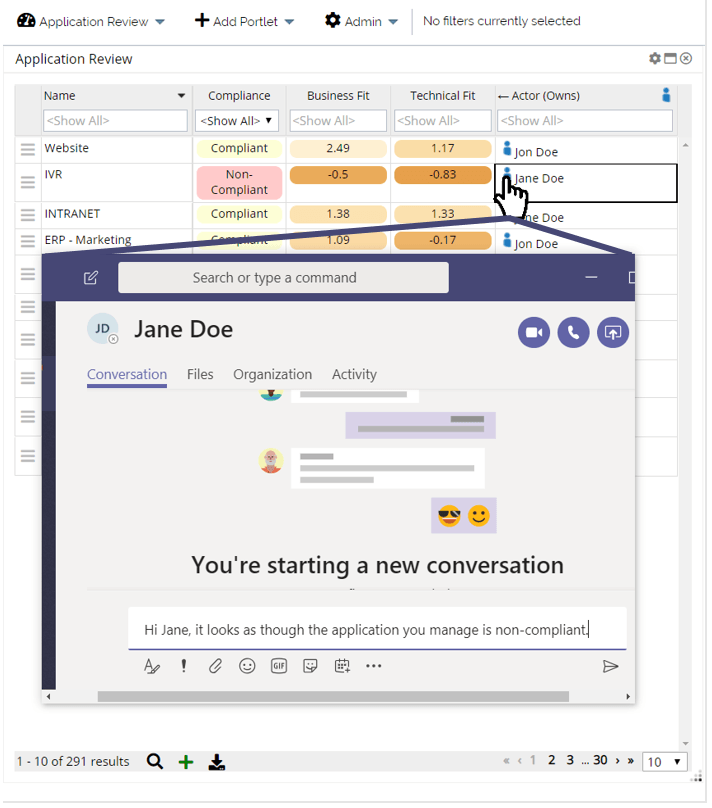 Users collaborate with stakeholders by initiating a chat or email conversation directly from a dashboard. Leverage Teams, Skype for Business, or email to open a conversation with an application manager, process owner or another stakeholder