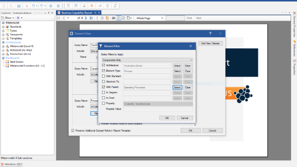 Users can surface and publish key information for a single type of component in a given architecture or project with details including the property field, property type field, property description field, and standard properties field for the single component type query. They will also be able to use filters when reporting on a collection of elements to more easily generate documentation based on elements that have a specific parent, or combine these with other filters to further narrow down report dataset selections quickly.